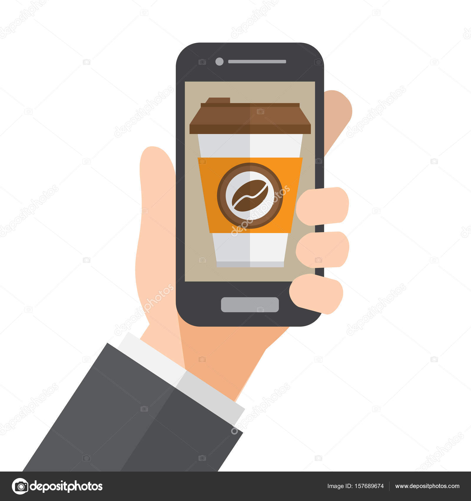 Online Order Coffee And Delivery Hand Holds Smartphone Vector Illustration Stock Vector C Kwankwann21 157689674