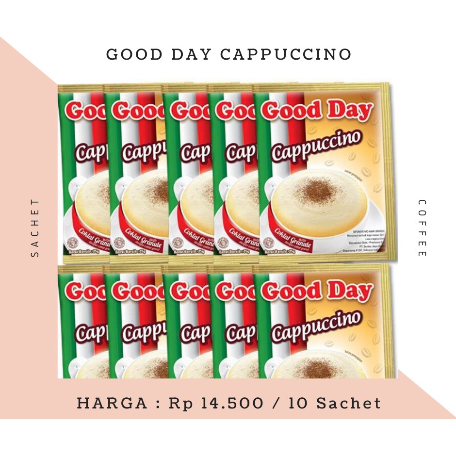 Kopi Sachet Good Day Cappuccino 10 X 25 Gram Shopee Indonesia. This is instant coffee, also called soluble coffee, coffee crystals, and coffee powder is a beverage derived from brewed coffee beans that enable peopl. Good day cappuccino instant coffee ingredients: Good day cappuccino are safe from any harmful additives and are made keeping the consumer's health in mind. Good day cappuccino can be used by individual consumers as well as retail outlets and businesses looking for an alternative to traditional coffee. Good day's smooth & tasty cappuccino allows you to enjoy moments wherever you are. Buy other coffee and get the best deals at the lowest prices on ebay! Good day coffee drink avocado delight botol 250ml. Ibrahim jabra & sons sal. More than 74 good day cappuccino at pleasant prices up to 19 usd fast and free worldwide shipping! Empty one whole sachet into a cup added â± 125cc hot water (80ºc) for ideal taste. Frequent special offers and discounts up to 70% off for all.a wide range of available colours in our catalogue: We don't just sale product, rather we provide service, try best to offer only those goods, in which quality we are sure. Great savings & free delivery / collection on many items. 1 sc good day cappuccino, 2 sdm gula pasir, 2 sdm air dingin, secukupnya whip cream, 200 ml susu uht. Gray, black, blue, multicolor, pink, coffee, green, purple, brown, red, white.