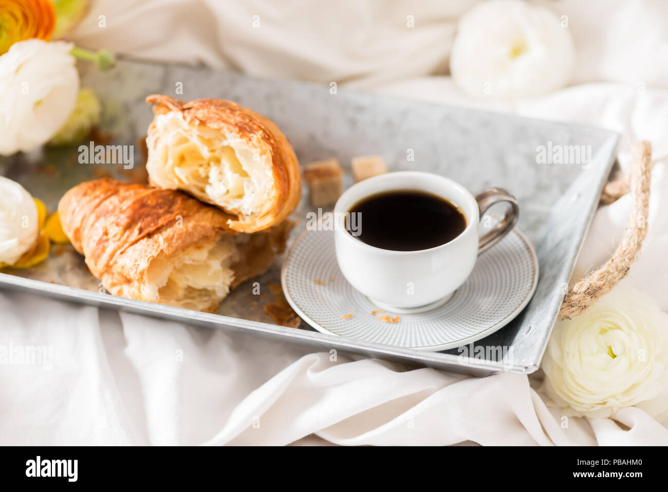 Breakfast In Bed From Fresh Croissant And Cup Of Coffee On The Grey Tray Ranunculus Flowers Nearby Stock Photo Alamy